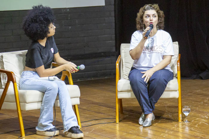 Rozana Naves respondeu a cada uma das perguntas com entusiasmo. “Nosso coração bate feliz quando vê vocês aqui”, afirmou, logo após a apresentação de Carinhoso, de Pixinguinha, executada pelo grupo de choro No Improviso, responsável por animada interação na abertura do encontro. Após informar ao público que nasceu e cresceu em Taguatinga, ela disse sentir-se gratificada pela presença dos estudantes e falou sobre o trabalho permanente para promover pluralidade e inclusão na Universidade.