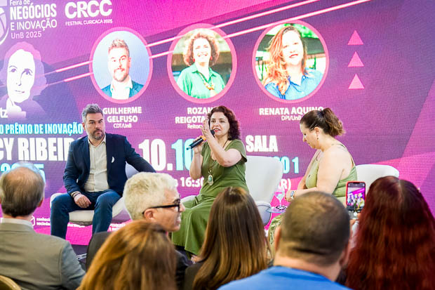 A mesa de honra foi composta pela reitora da UnB, Rozana Reigota Naves, pela decana de Pesquisa e Inovação, Renata Aquino, e pelos diretores do Centro de Apoio ao Desenvolvimento Tecnológico (CDT), Guilherme Gelfuso, e do Parque Científico e Tecnológico (PCTec), Renato Borges.
