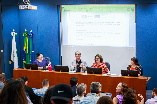 O Conselho Universitário (Consuni) aprovou por aclamação a concessão de título de Professor Emérito ao docente da Faculdade de Tecnologia (FT) Humberto Abdalla Júnior. Na ocasião, a reitora Rozana Naves informou sobre a suspensão da greve dos servidores técnico-administrativos, com retorno das atividades na segunda-feira (6). Houve ainda a apresentação da marca da Semana Universitária (Semuni). A reunião ocorreu nesta sexta-feira (3), no Auditório da Reitoria, campus Darcy Ribeiro, Asa Norte.