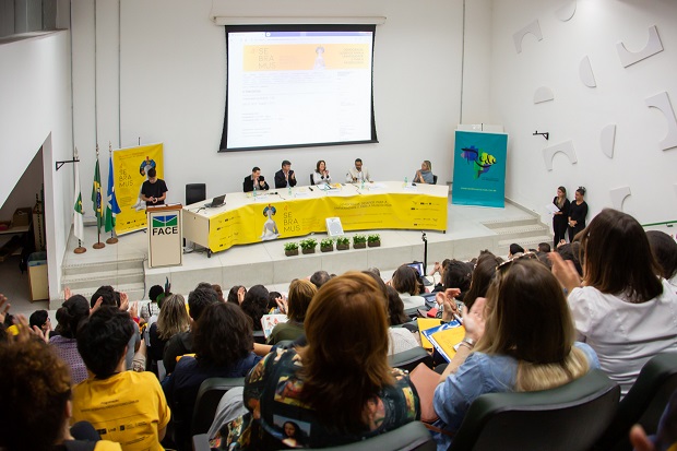 Com o auditório verde da Faculdade de Administração, Contabilidade, Economia e Gestão de Políticas Públicas (Face) lotado, o Sebramus iniciou suas atividades na segunda-feira (29), recordando a trajetória do evento e da expansão do curso de Museologia pelo Brasil. Na mesa de cerimônia, estavam presentes a reitora Márcia Abrahão, a professora e coordenadora do curso de Museologia da UnB, Monique Batista Magaldi, o diretor da FCI, Renato Tarciso Barbosa, o professor e coordenador do Programa de Pós-Graduação em Ciência da Informação, João de Melo Maricato, e o professor da Universidade Federal de Pernambuco (UFPE) e coordenador da Rede de Professores e Pesquisadores em Museologia, Bruno Melo de Araújo.