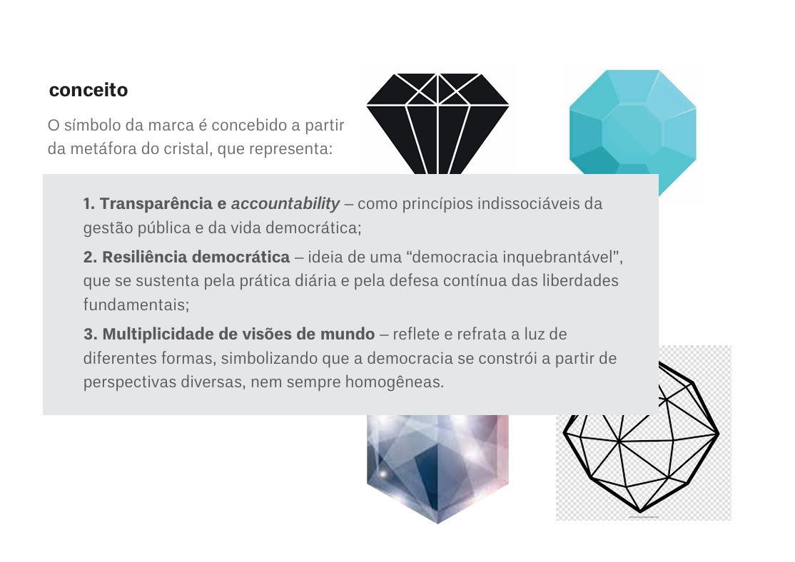 O conceito gráfico utiliza a metáfora do cristal para representar a diversidade de olhares que compõem a vida universitária e que constroem o campo democrático. “O cristal reflete e refrata a luz de diferentes formas, simbolizando que a democracia se constrói a partir de perspectivas diversas, nem sempre homogêneas", pondera o servidor técnico Igor Outeiral, responsável pelo desenvolvimento visual da proposta.